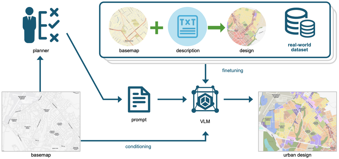 该框架利用视觉大模型(VLM)将抽象的文本概念转化为具体的、可视化的城市设计方案。规划师可以通过文本指令(Prompt)精确描述规划概念和约束条件,经过城市设计数据微调的VLM能够生成精细的视觉输出,如土地利用布局、建筑轮廓,甚至是逼真的三维城市场景,同时还能确保设计符合地理等现实约束。