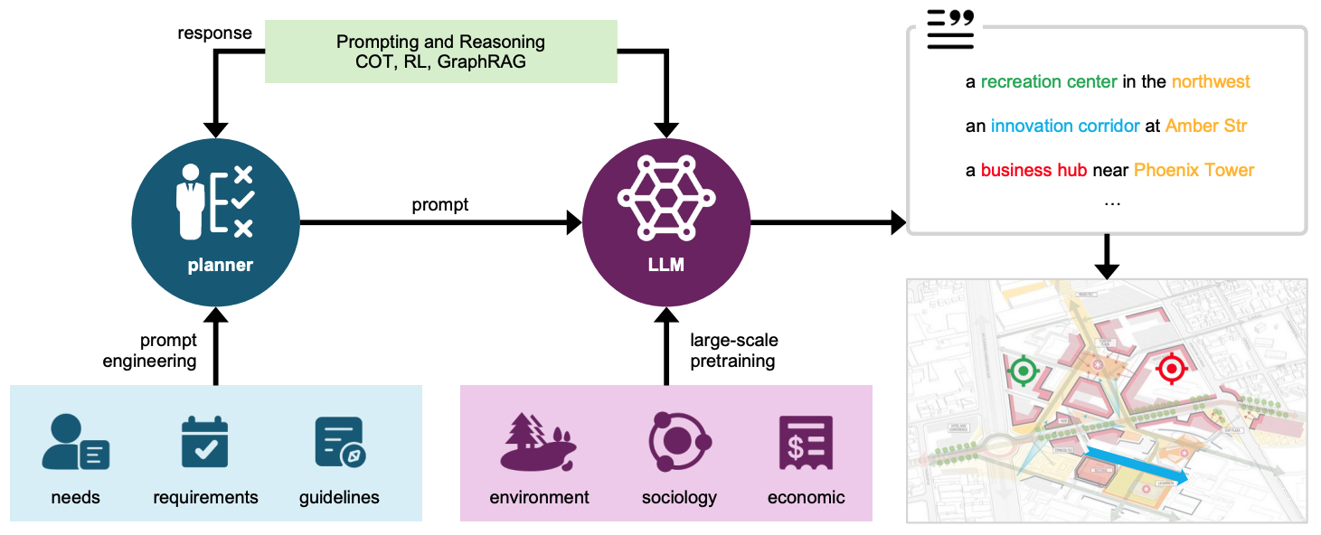 针对传统方法的不足,研究团队创新性地提出了一个包含概念设计(Conceptualization)、方案生成(Generation)和效果评估(evalsuation)三个核心阶段的闭环框架。该框架由大语言模型、视觉大模型(VLM)和大模型智能体(LLM Agent)协同驱动,为人类规划师提供全流程的智能辅助。