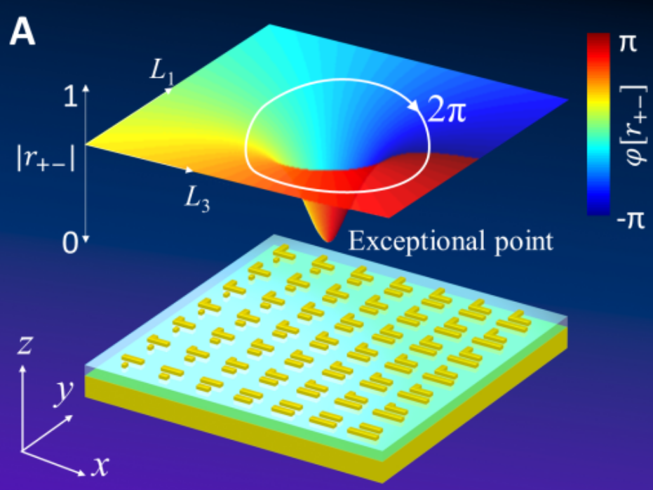 该研究提出一种全新的相位调控方法,研究了非厄密超构表面的拓扑性质,探讨了其受拓扑保护的360度相位实现方法。结果表明,通过设计非厄密拓扑超构表面,可以产生一个奇异点。奇异点在光学当中也是一种“龙卷风”的“风眼”,围绕这个“风眼”一圈,光的相位可以产生360度的累积。而且这种360度相位累积受该“风眼”拓扑保护,与所围绕的路径无关。