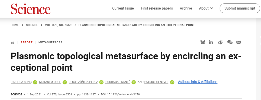 2021年9月3日,宋清华以第一作者身份在《科学》(Science)杂志发表题为“围绕奇异点的等离子体拓扑超构表面”(Plasmonic topological metasurface by encircling an exceptional point)的文章。